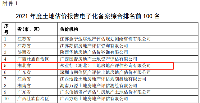 2022年4月1日,中国土地估价师与土地登记代理人协会发布《关于2021年度土地估价报告电子化备案排名结果的公告》,永业行公司综合排名湖北第一、全国第五!备案报告数方面,永业行排名湖北第一、全国第十;备案总评估额方面,永业行排名湖北第一、全国第十七;总评估面积方面,永业行排名湖北第二、全国第二十六;总收费额方面,永业行排名湖北第二、全国第十七。