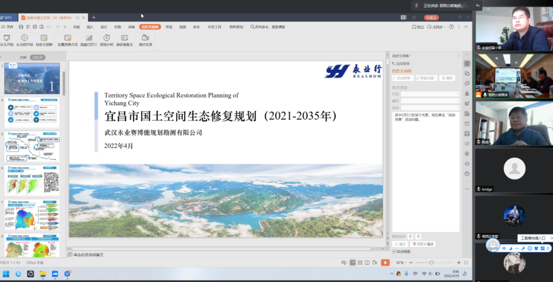 2022年4月19日,宜昌市自然资源和规划局组织召开了宜昌市国土空间生态修复规划(2021-2035年)专家论证会,会议采取“线上+线下”方式进行,由市局党组成员、副局长王玉伟主持,局生态修复科、规划科等相关科室领导、永业行助理总裁兼鄂西区总经理雷小明及项目组成员参加了会议。