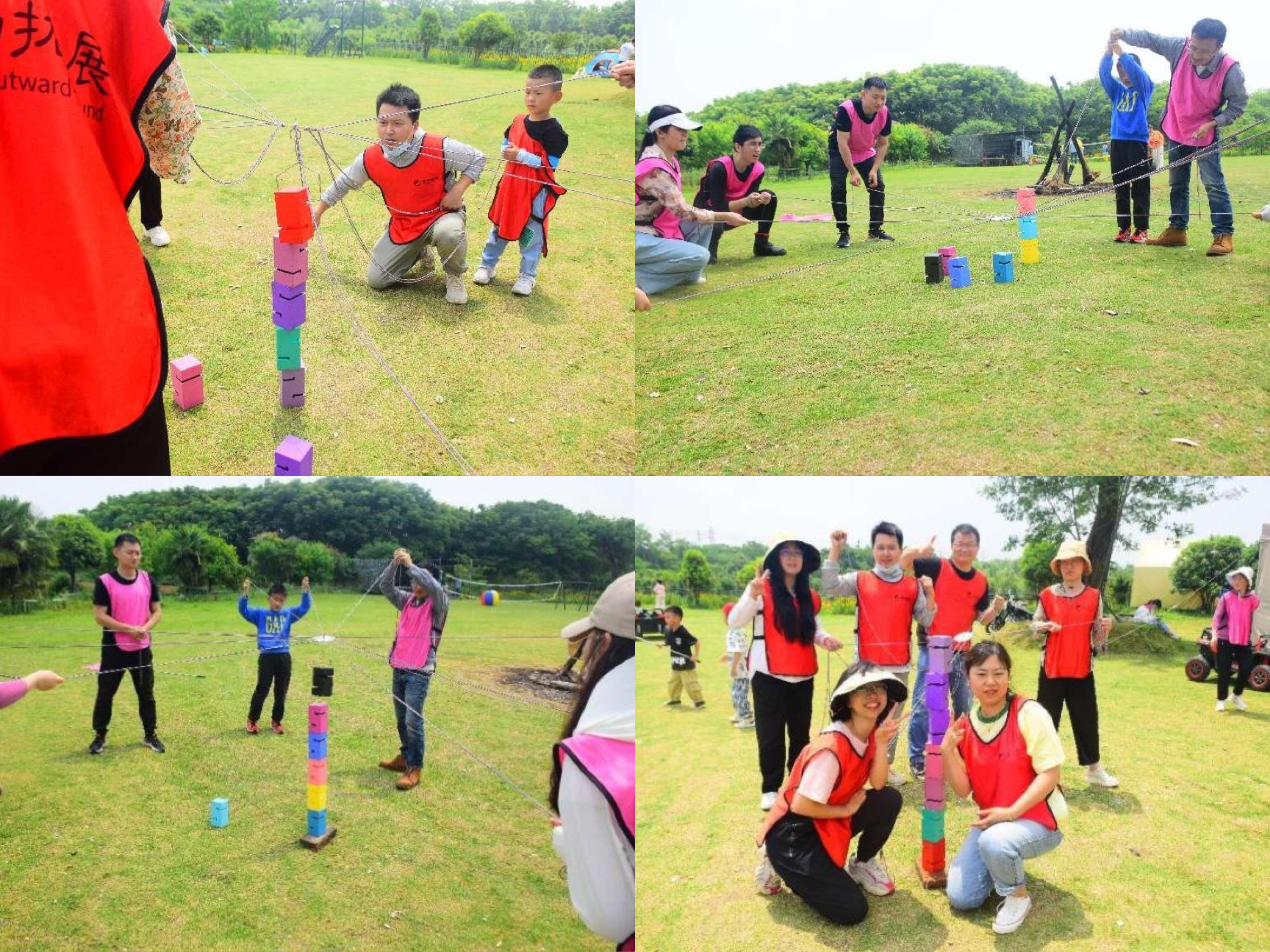 大家一起拉紧绳头来控制塔钩移动,用塔钩将一块块塔吊起并。最先挑战搭建6层塔保持5秒不倒的队伍获胜。在一次次尝试,失败,再次尝试后,“青云队”率先完成任务,并突破自我,搭建7层宝塔。
