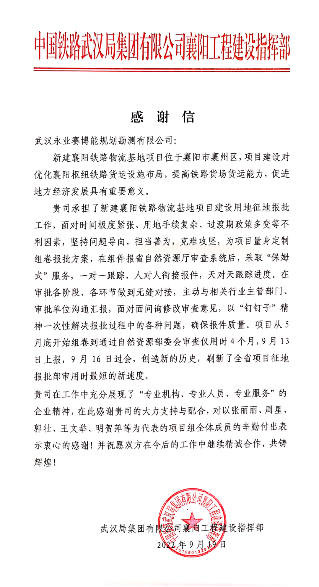 2022年9月19日,中国铁路武汉局集团有限公司襄阳工程建设指挥部致函永业行,对我司承担的新建襄阳铁路物流基地项目用地报批工作给予肯定和感谢。