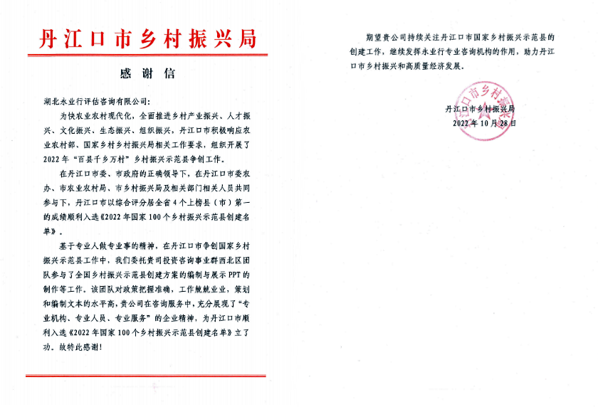 10月28日,丹江口市乡村振兴局致函永业行,对我司承担的丹江口市国家乡村振兴示范县创建方案及展示PPT等工作给予肯定和感谢。