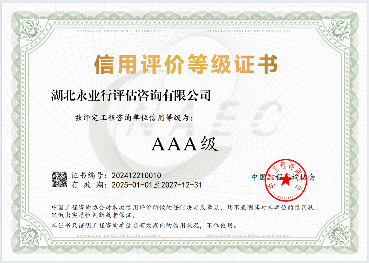 近日,中国工程咨询协会公布了“2024年度中国工程咨询协会信用评价名单及等级”,本次评定为首次评定,永业行凭借卓越的综合实力,荣膺“工程咨询单位信用评价AAA级”评价,为此次评定中的最高等级。