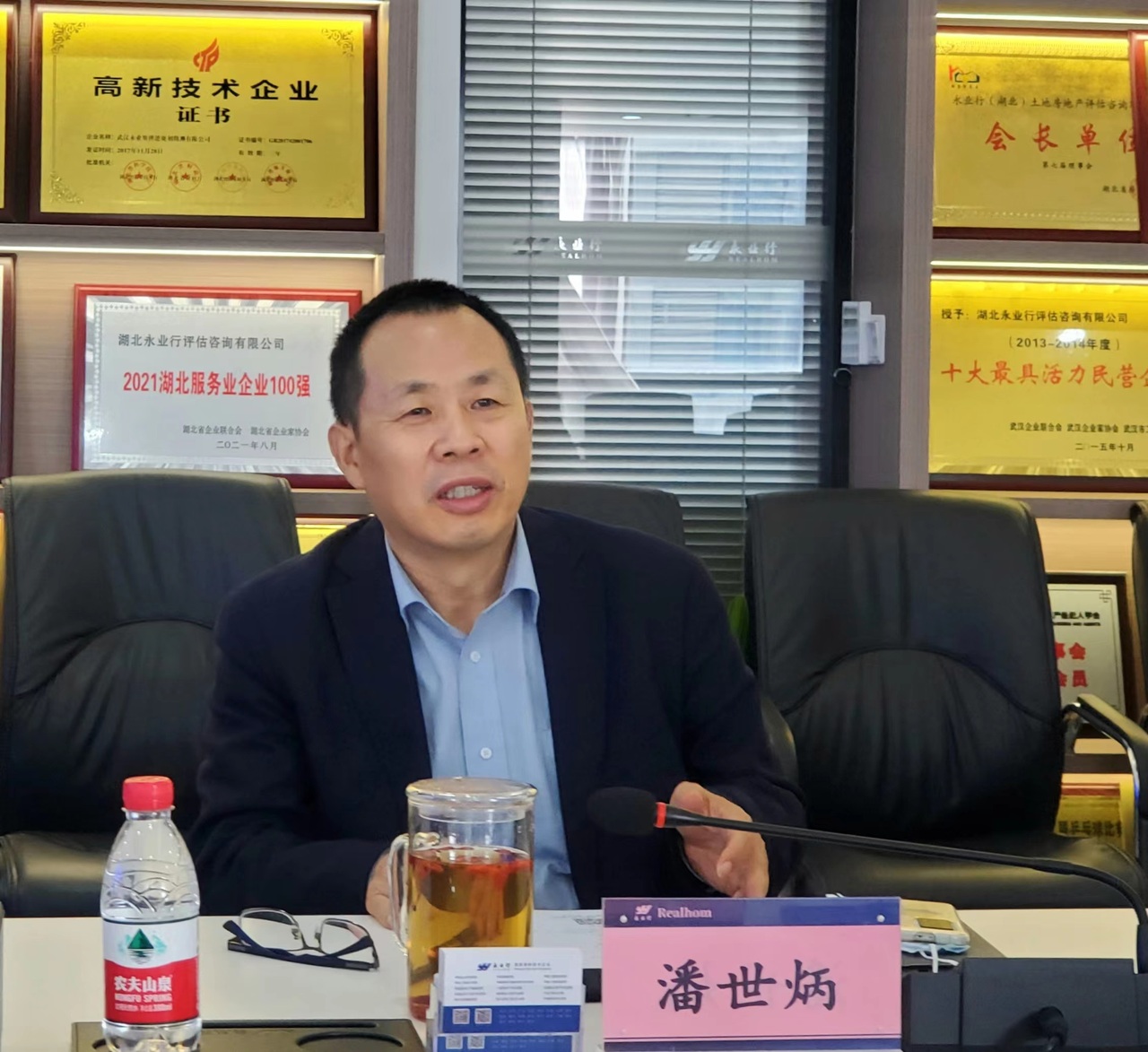 潘世炳首先对朱缨主席一行莅临永业行表示热烈欢迎,感谢区总工会和徐家棚街道对永业行的关心和支持。他从历史沿革、党建引领、科研创新、永业行、社会责任、人才队伍、工会组织建设和员工关爱等方面介绍了公司整体情况,全面展示了永业行行业地位领先、高新人才众多、科研成果丰富、内部管理高效和工会工作的各项优势和特色。