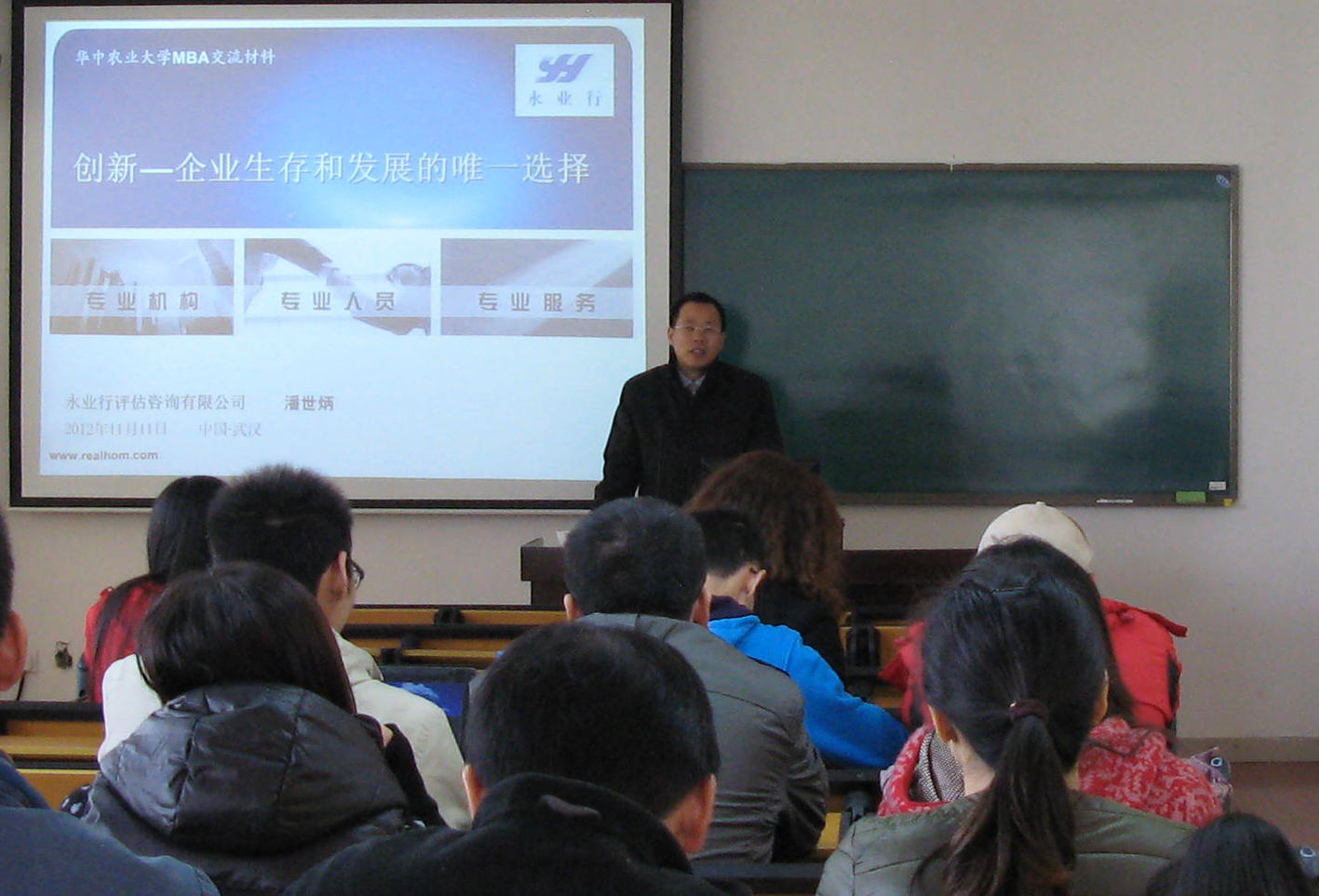 11月11日,应华中农业大学MBA教育中心邀请,永业行总裁潘世炳给华中农业大学近50名MBA、MPA研究生等作了题为《创新是企业生存和发展的唯一选择》的专题讲座,从为什么创新是企业生存和发展的唯一选择、企业需要哪几个方面的创新、企业创新应该关注哪几个问题等三个方面,和同学们进行了交流,并回答了大家的提问。本次讲座由华中农业大学经济管理-土地管理学院严奉宪教授主持。