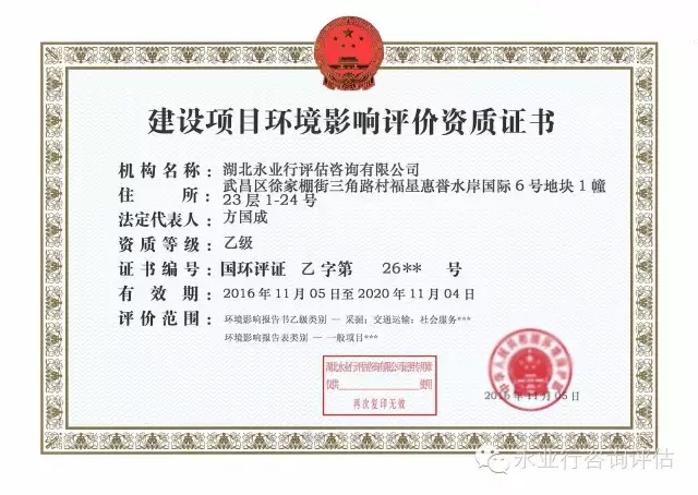 2016年12月2日,永业行环境影响评价资质顺利延续