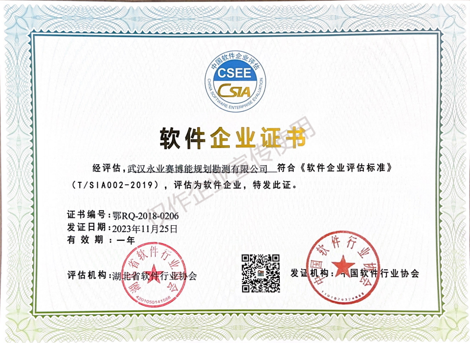 近日,中国软件行业协会发布软件企业复评结果,武汉永业赛博能规划勘测有限公司软件企业资质成功通过复评。