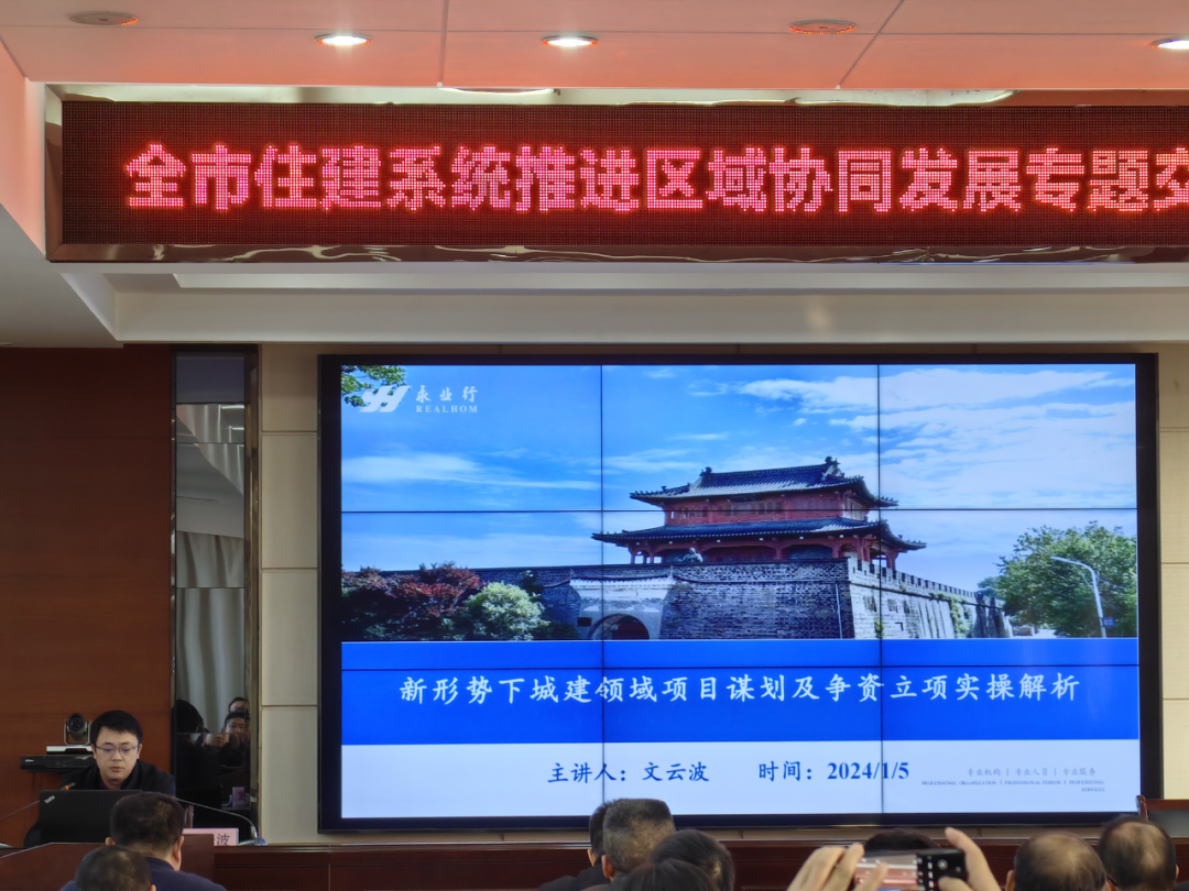 2024年1月5日,襄阳市住房和城乡建设局召开全市住建系统推进区域协同发展专题交流培训会,永业行高级副总裁文云波受邀作新形势下城建领域项目谋划及争资立项实务解析专题培训交流,市住建局党组成员、副局长张德平出席会议,市住建局党组成员、副局长章成强主持会议。
