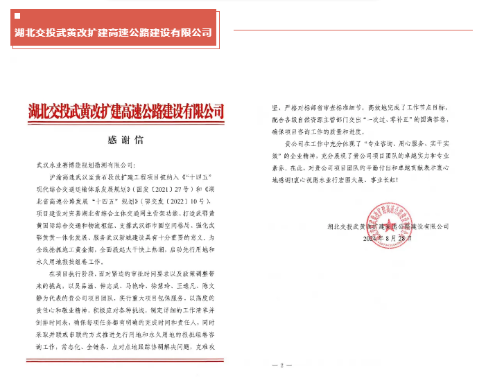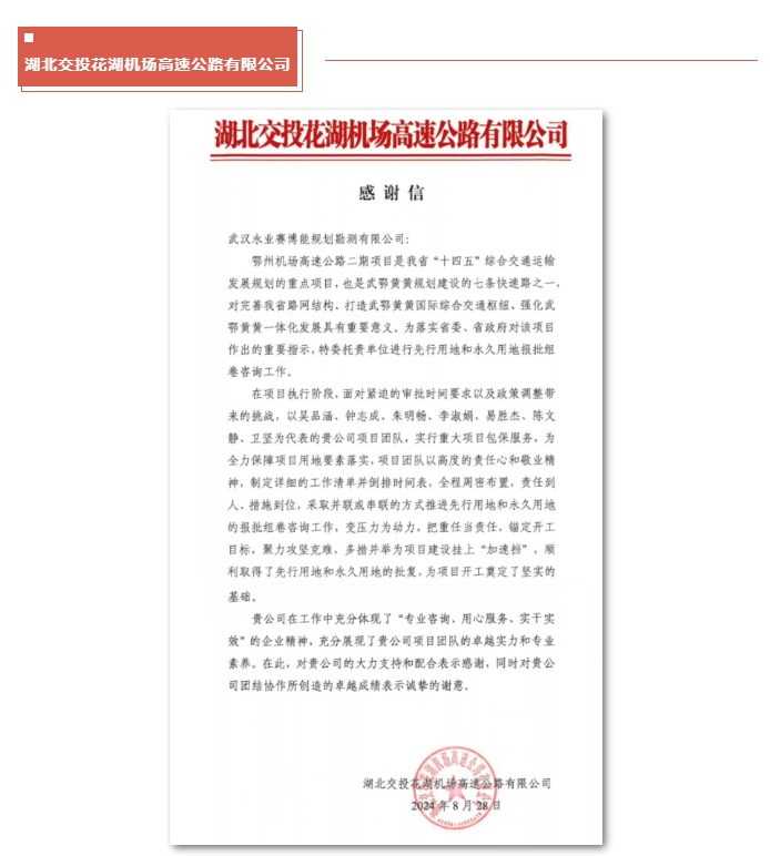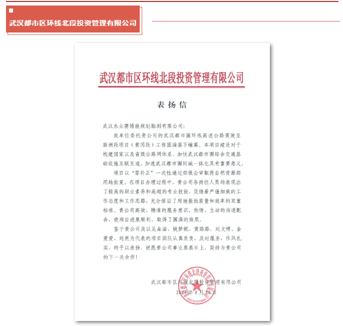 近期,永业行陆续收到来自武汉都市区环线北段投资管理有限公司、湖北交投武黄改扩建高速公路建设有限公司、湖北交投花湖机场高速公路有限公司发来的表扬信和感谢信。