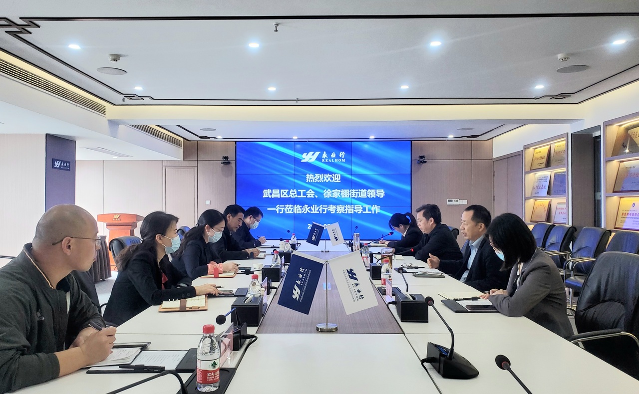 2022年5月13日,武昌区总工会党组书记、常务副主席朱缨一行莅临永业行,就工会相关工作进行考察指导。区总工会副主席江万信、办公室主任兰斌、维权服务部部长蒋志斌和武昌区徐家棚街道纪工委书记张静等陪同考察。永业行党委书记、董事长潘世炳,副总裁程为民一行热情接待考察组并进行座谈。